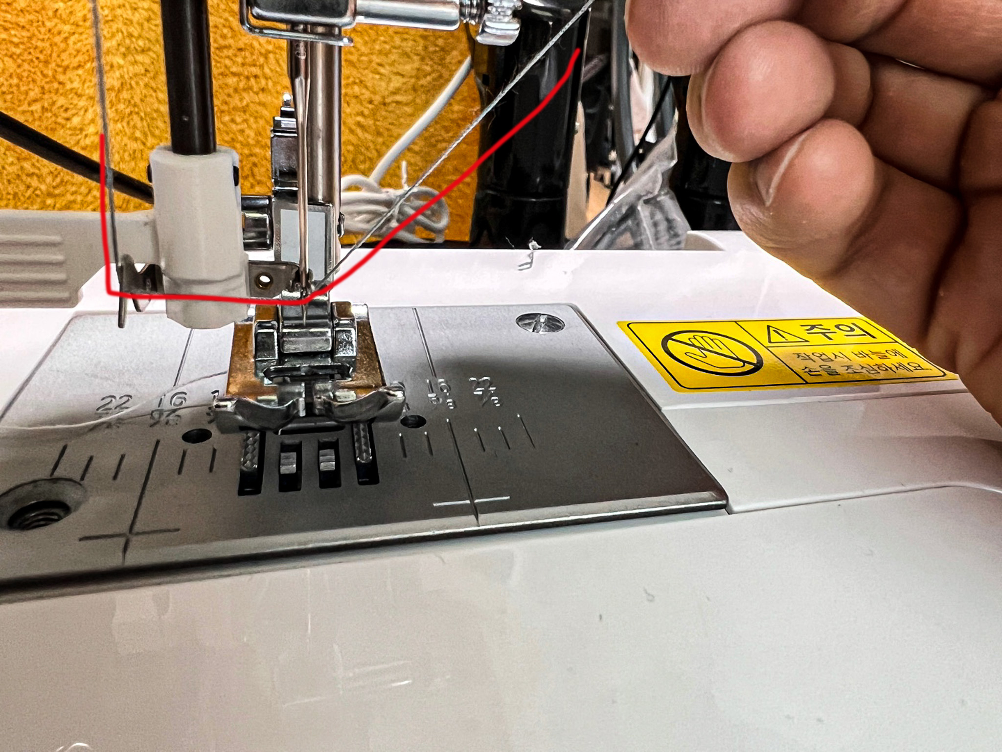 요렇게 실이 걸린다 실을 뺀 후 노루발 밑으로 정리를 해주면 되는데.