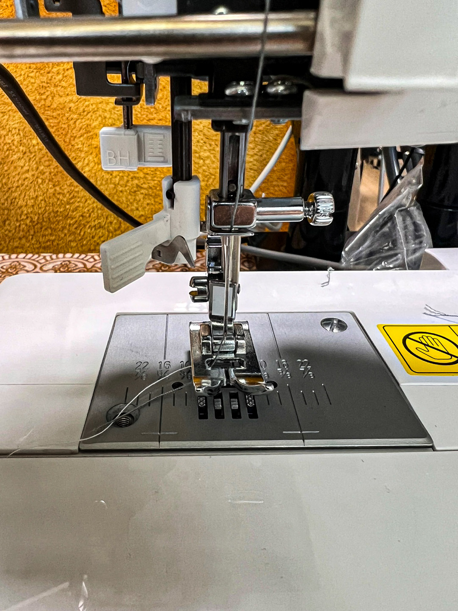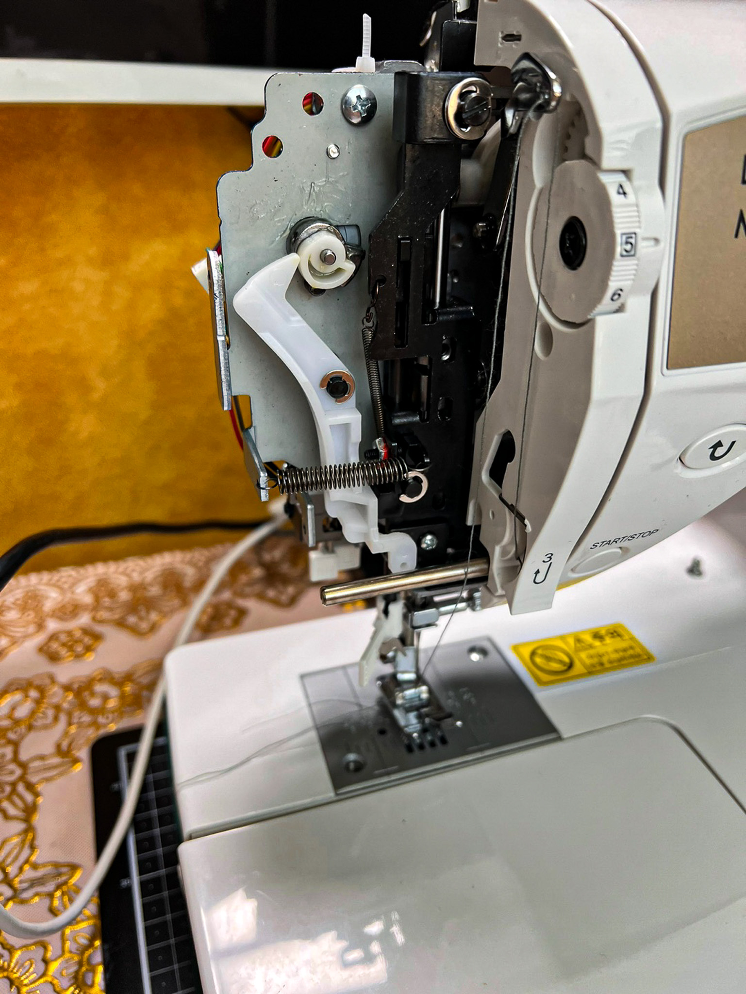 1. 사진상 왼쪽 상단에 보이는 하얀색 손잡이가 자동 실 끼우기 레버이다.