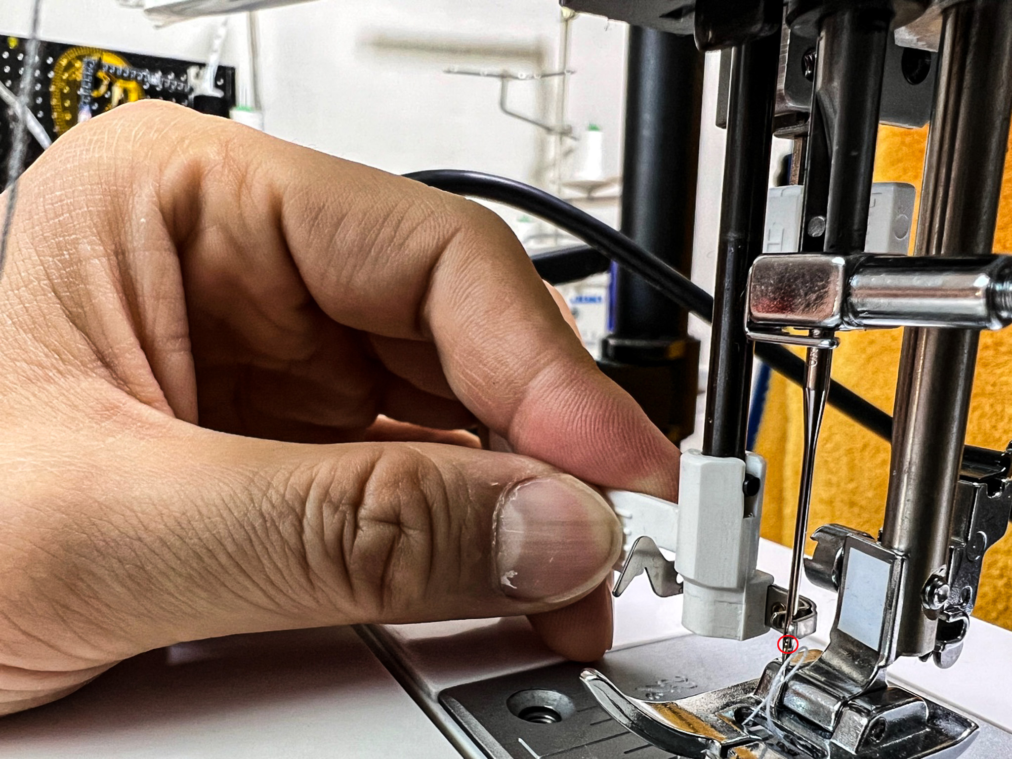 일단 기계 우측의 레버를 돌려서 바늘을 최상단에 위치시킨다.